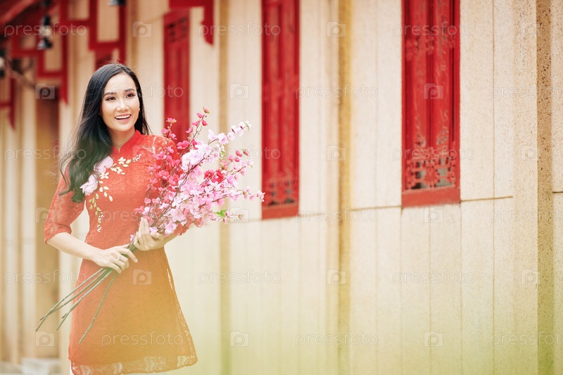 Женщина с цветущими персиковыми ветвями
