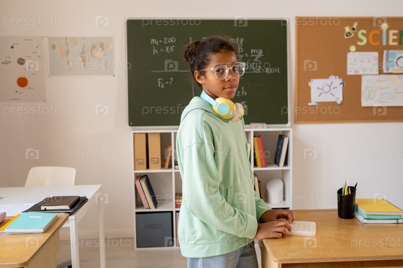 Смешанная раса школьница в повседневной одежде стоит у своего стола