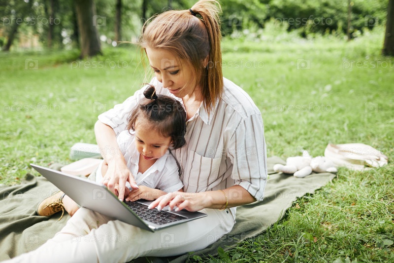 Мать, использующая ноутбук в парке