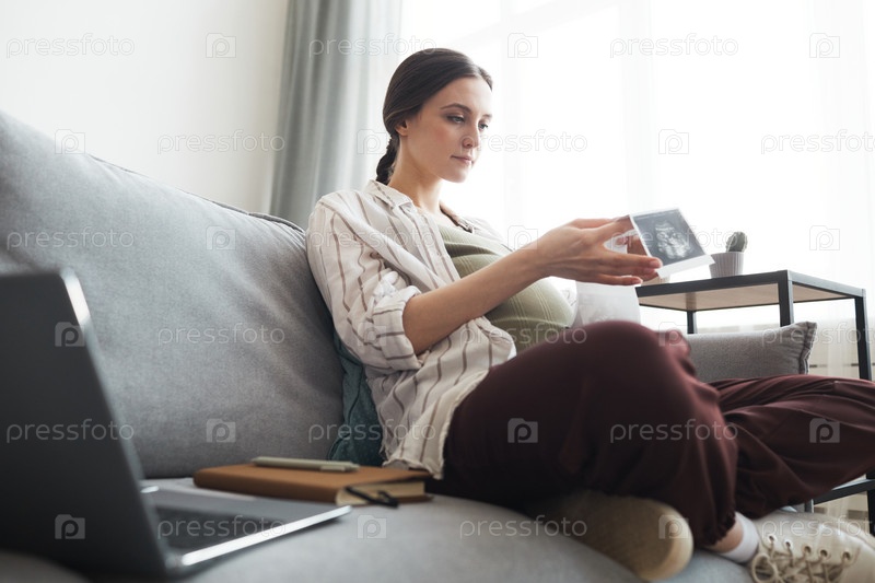 Беременная женщина сидит на диване