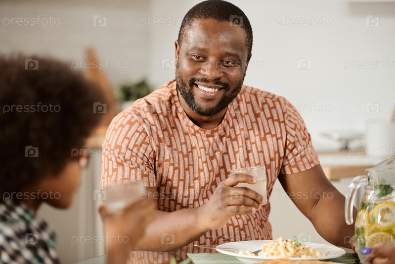 Молодой улыбающийся мужчина с бокалом лимонад разговаривает со своим маленьким сыном