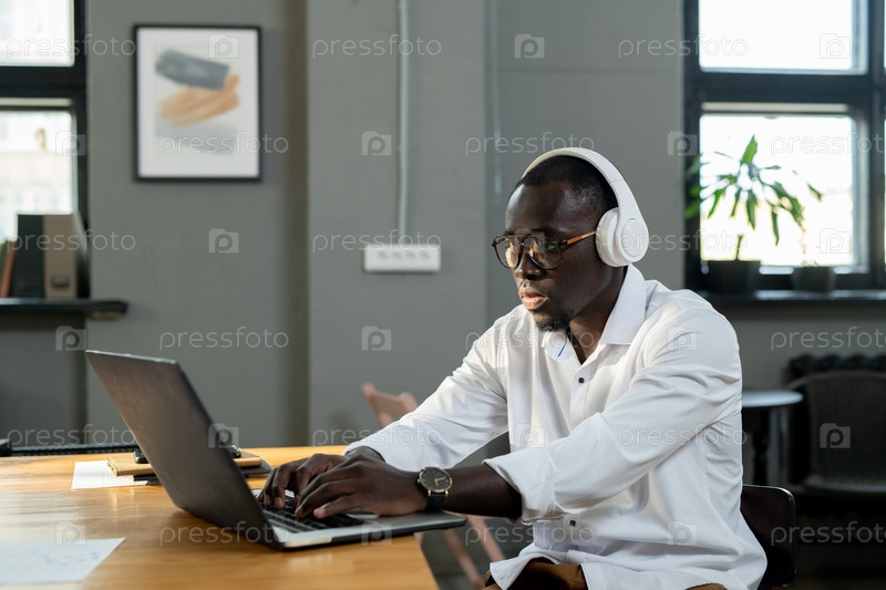 Молодой рабочий белого воротничка в наушниках, работающий с онлайн-данными