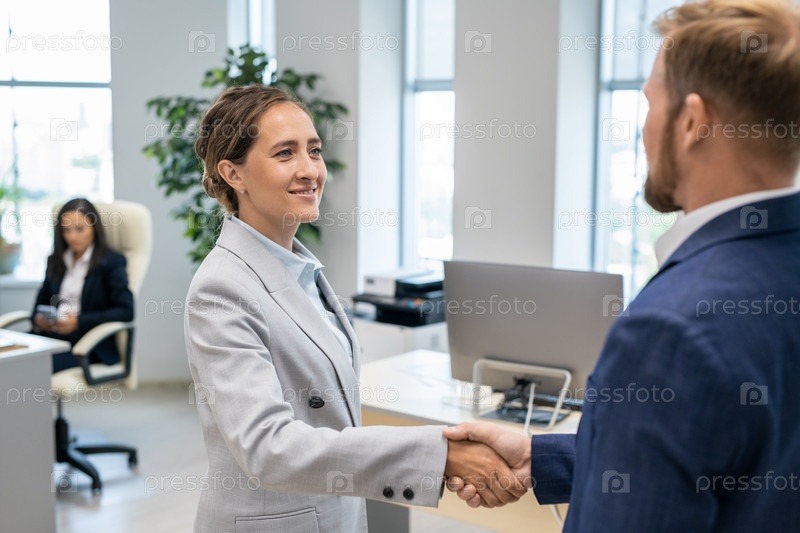 Два успешных коллеги в формальной одежде пожали друг другу руки после подписания контракта