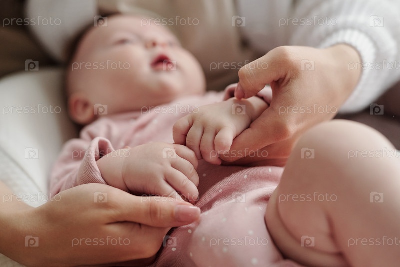 Руки молодой матери, успокаивающей ребенка в то время как обнимает ее