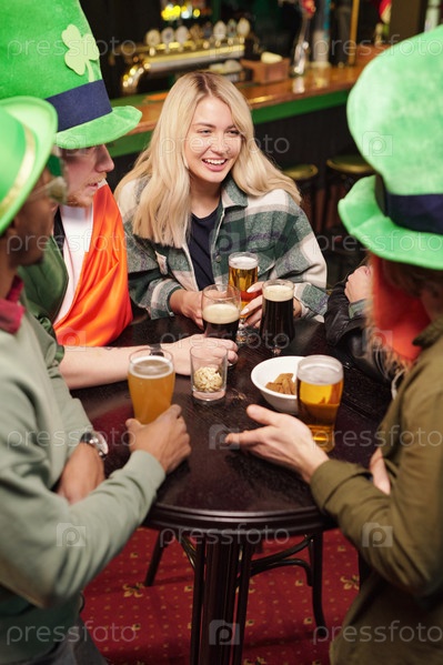 Группа счастливых молодых межкультурных друзей в зеленых шляпках, пьющих пиво со закусками