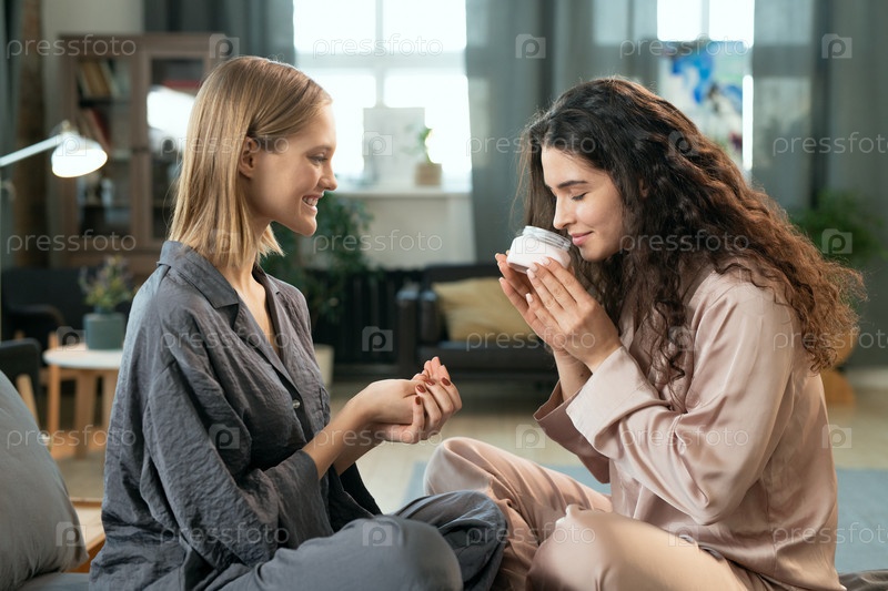 Две девушки в пижаме наносят и нюхают натуральный косметический продукт ручной работы