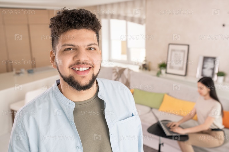 Счастливый молодой бородатый мужчина в повседневной одежде смотрит на вас с зубчатой улыбкой против своей жены, использующей ноутбук