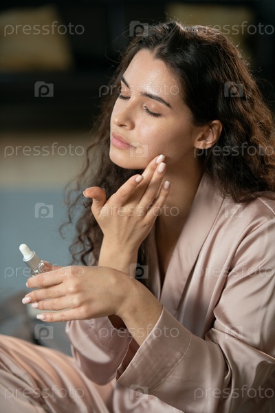 Молодая довольная женщина в пижаме, наносящая натуральный косметический продукт на лицо
