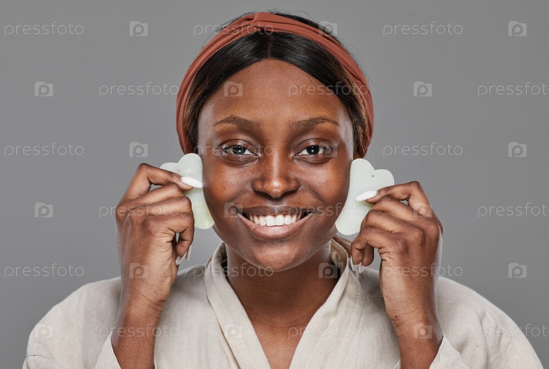 Улыбающаяся афроамериканская женщина наслаждается массажем лица