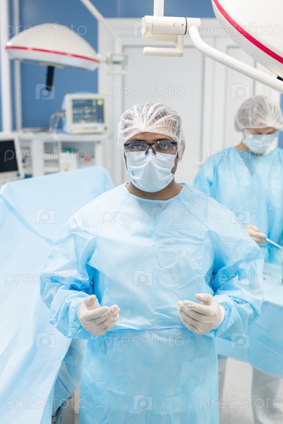 Хирург в форме, маске, перчатках и очках стоит против своего помощника