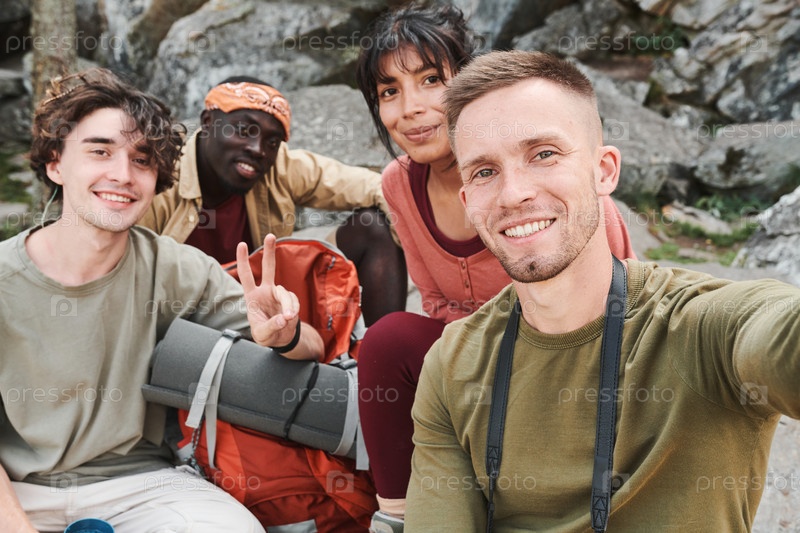Селфи улыбающихся молодых межрасовых туристов, сидящих на скалах и позирующих для камеры на открытом воздухе