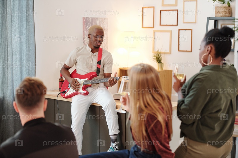 Молодые межкультурные друзья слушают пение африканского парня, играющего на гитаре