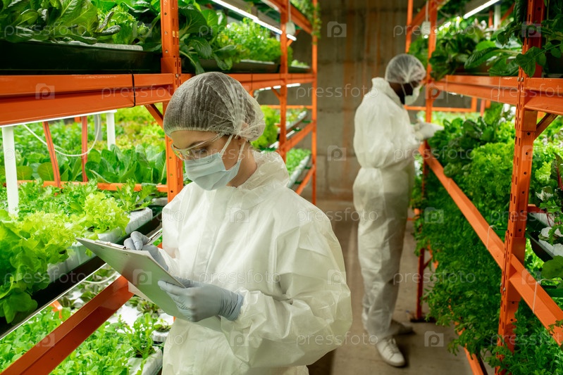 Женщина делает заметки о листьях на вертикальной ферме