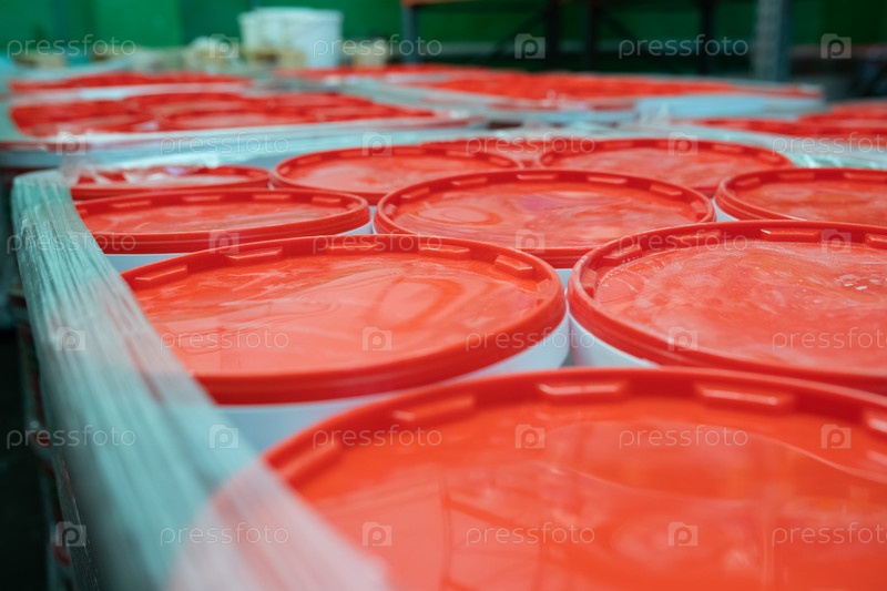 Контейнеры краски, завернутые вместе в растяжную пленку
