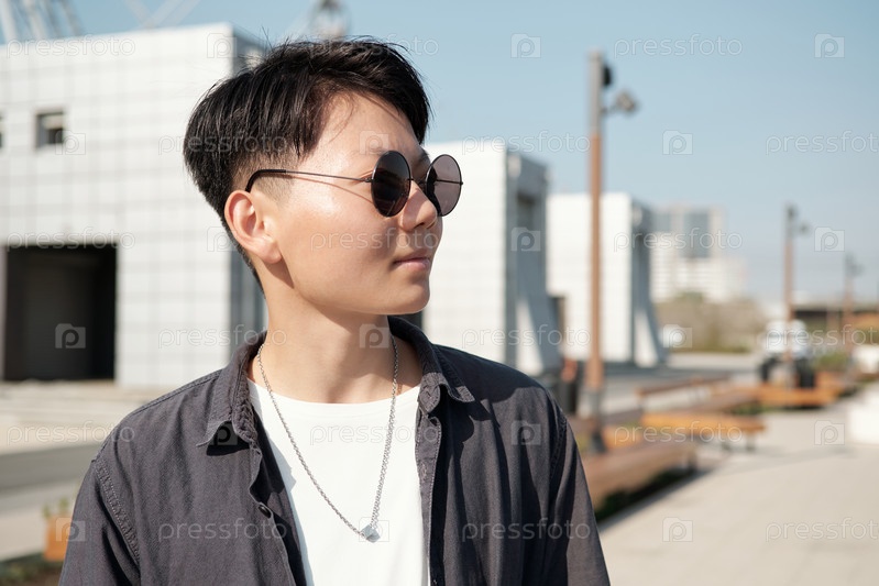 Молодая женщина азиатской этнической принадлежности, одетая в повседневную одежду и солнцезащитные очки