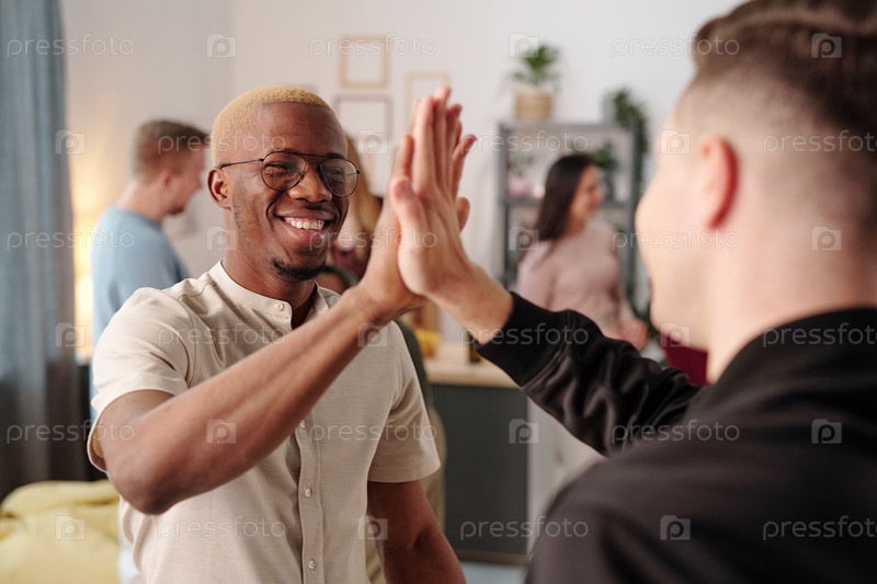 Счастливый молодой африканский мужчина в повседневной одежде и очках дает пять друзей