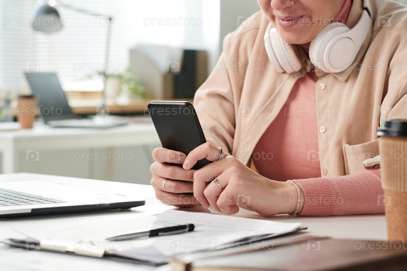 Близкий снимок содержимого Современная молодая бизнес-женщина в наушниках на шее сидит за столом в офисе и читает сообщение по телефону