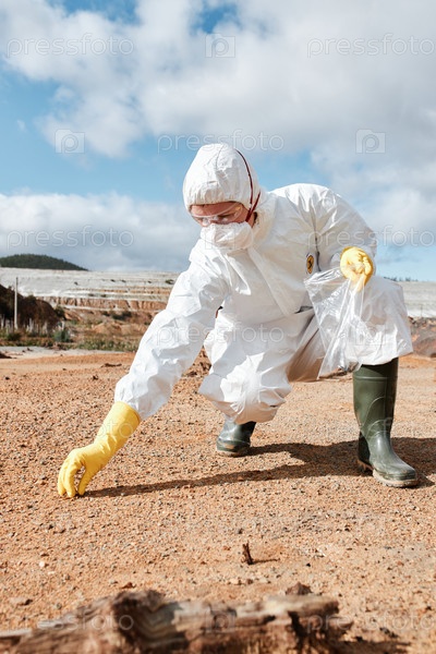 Экологический исследователь в области масок и защитных очков берет образец почвы и помещает его в резиновый мешок на загрязненной земле