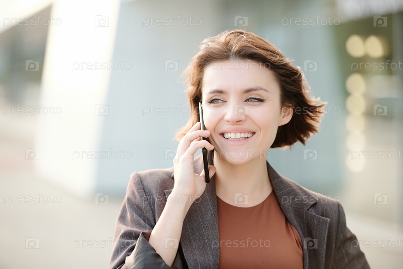 Молодая улыбающаяся бизнес-леди в умной повседневной одежде консультирует клиента по телефону