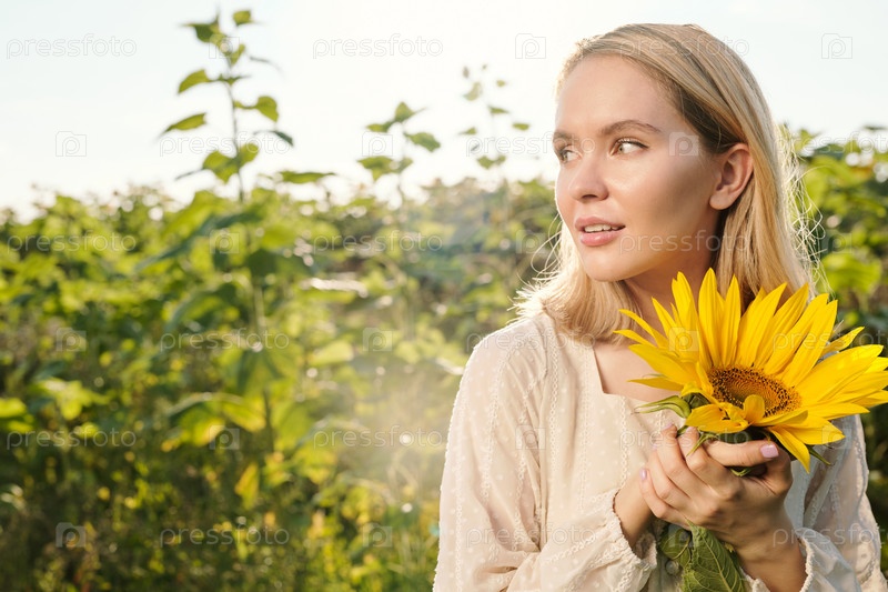 Веселая молодая блондинка в солнцезащитных очках и белом платье стоит на поле