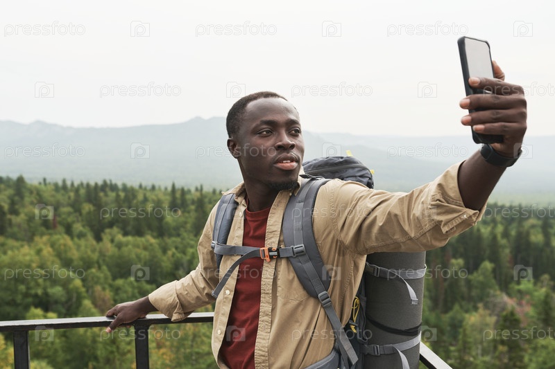 Красивый молодой чернокожий мужчина с рюкзаком стоит на мосту и делает селфи против лесного ландшафта
