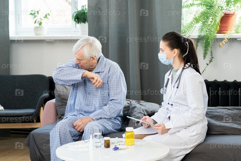 Молодой врач общей практики с планшетом смотрит на больного пожилого человека, который собирается кашлять