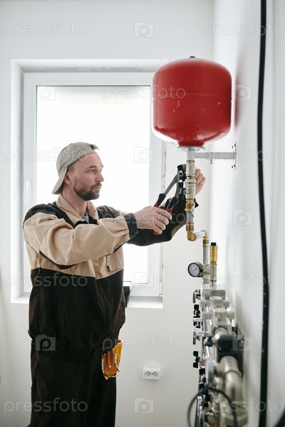 Ремонтник в униформе фиксирует часть трубы в новой квартире