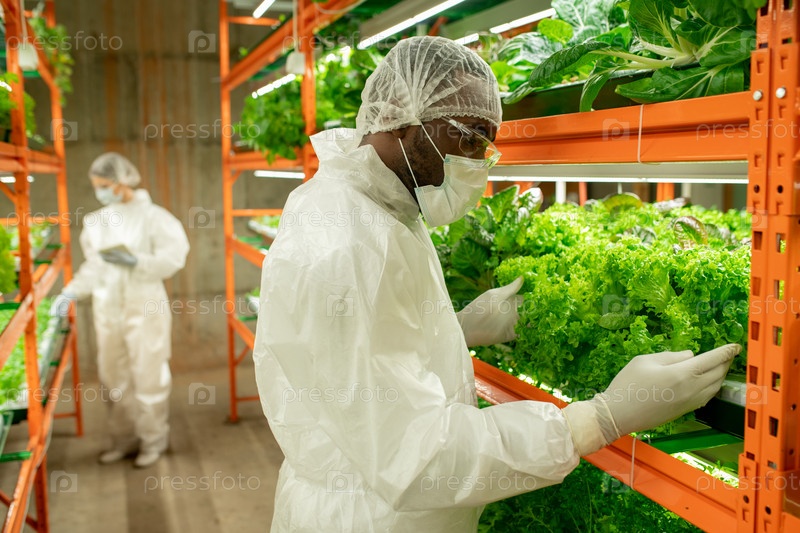 Молодой африканский агроинженер-мужчина стоит у полки с саженцами зеленого салата