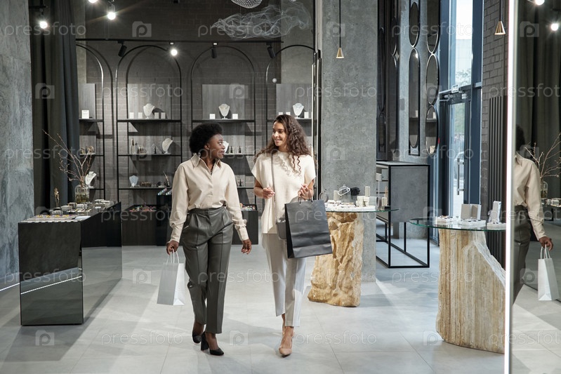 Молодые межкультурные женщины в элегантной повседневной одежде движутся по ювелирному магазину