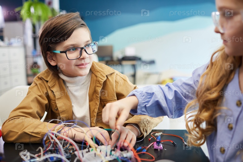 Улыбающиеся дети экспериментируют в классе робототехники