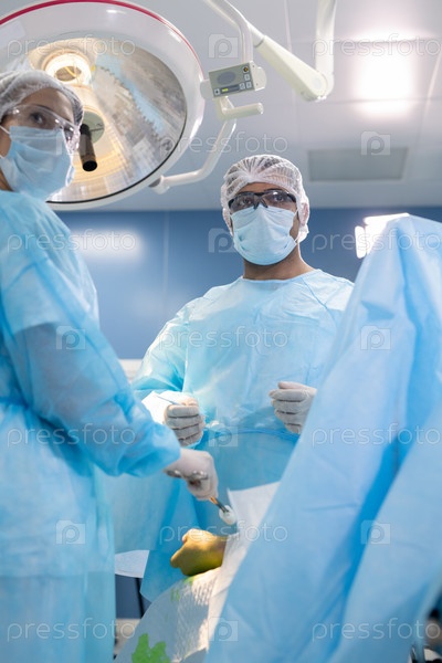 Серьезная ассистентка и хирург-мужчина смотрят на медицинские данные в экспозиции