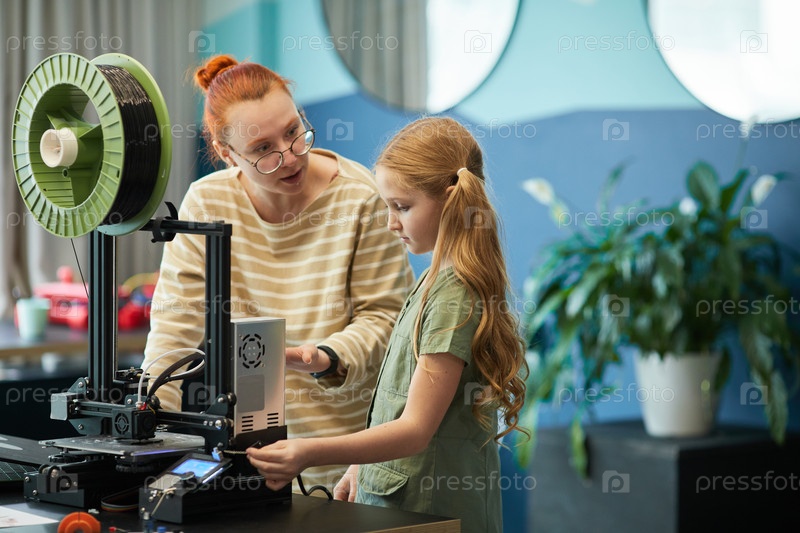 Учительница, использующая 3D-принтер с девочкой в инженерном классе