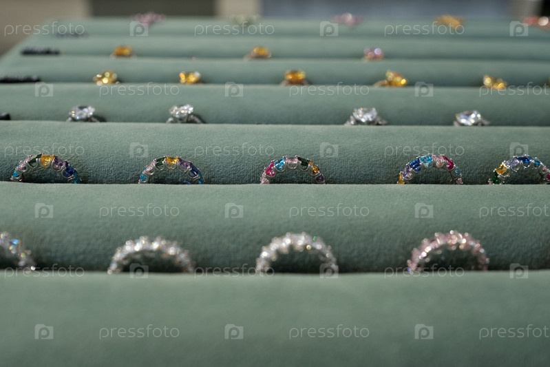 Выборочный фокус на одном из рядов колец с красочными драгоценными камнями