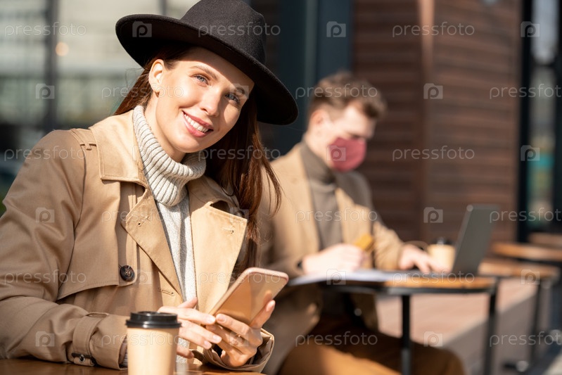 Молодая брюнетка-бизнесменка в шляпе, свитере и плаще использует смартфон