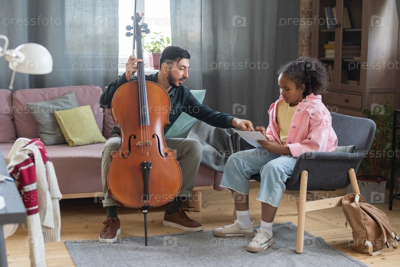 Молодая самоуверенная учительница музыки взаимодействует со школьницей