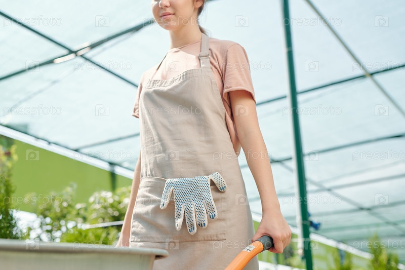 Молодая женщина-работница теплицы в фартуке толкает тележку с большим пластиковым горшком или контейнером