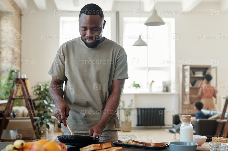 Молодой человек африканской этнической принадлежности стоял у электрической плиты на кухне и жарил что-то