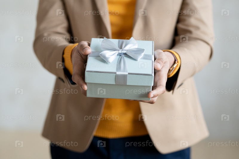 Руки молодого элегантного бизнесмена, передающего вам подарок в синей коробке с луком