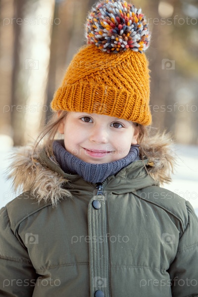 Милый ребенок в теплой куртке и вязанной коричневой шапочке смотрит на тебя снаружи