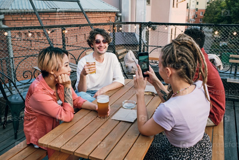 Девушка со смартфоном фотографирует своих друзей с напитками