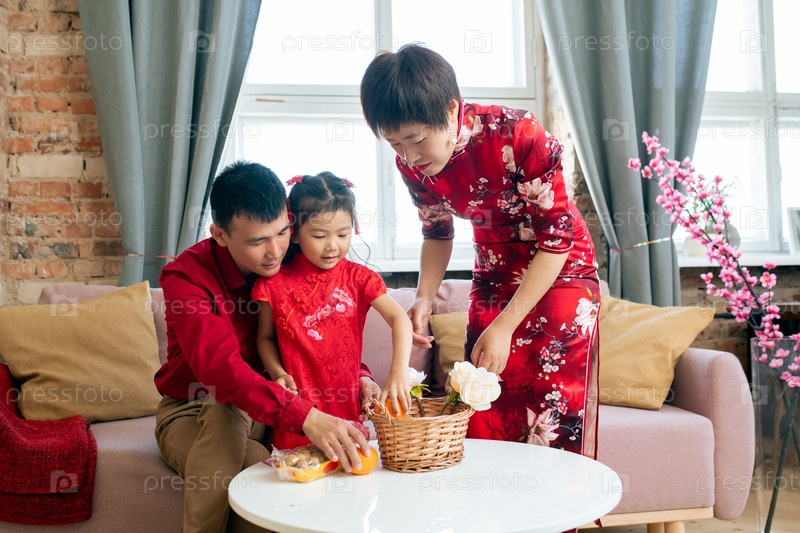 Китайская семья сидит за столом в гостиной