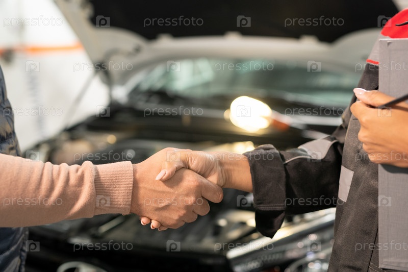 Молодой профессиональный техник автосервиса, пожавший руку клиенту в мастерской