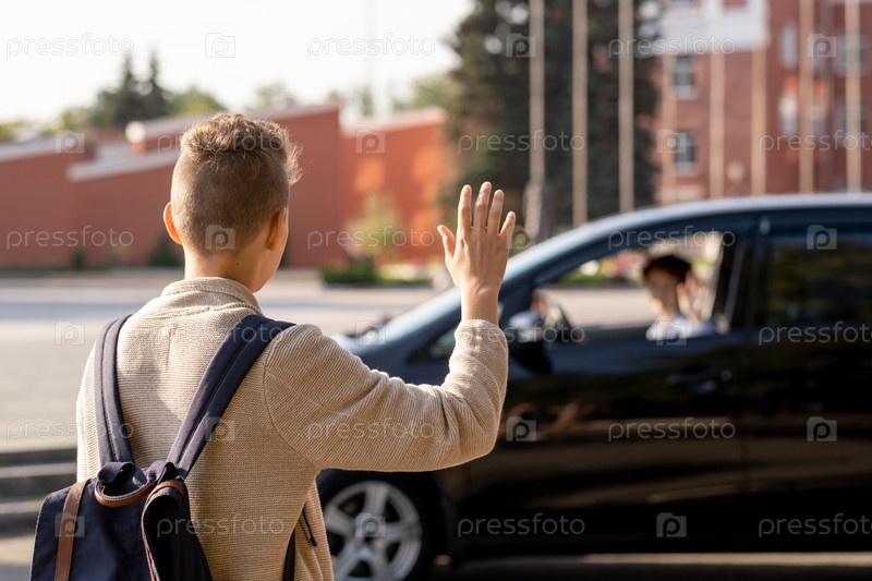 Школьник прощается со своей мамой в машине