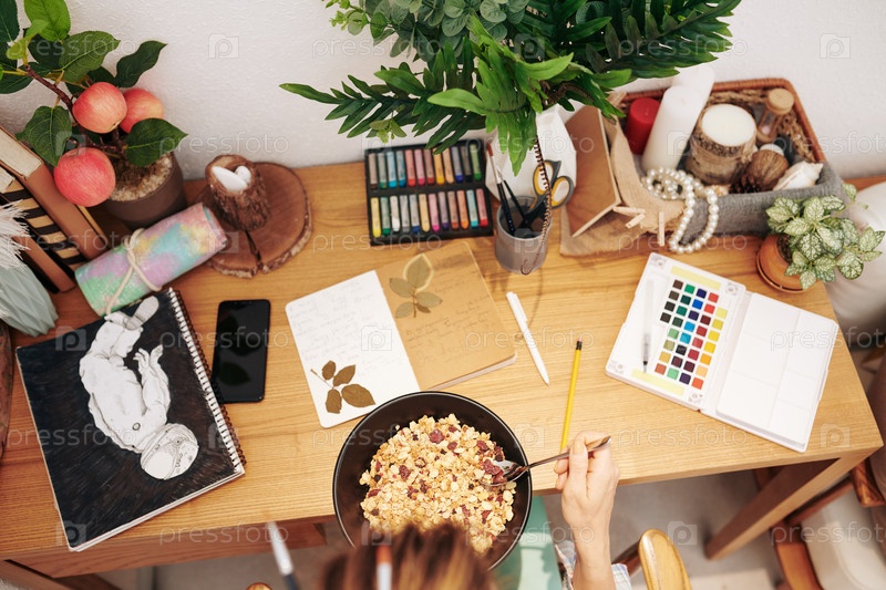 Съедает завтрак за столом