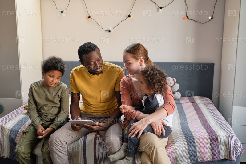 Счастливая молодая семья из четырех человек сидит на двухместной кровати, смотрит онлайн-видео и обсуждает его