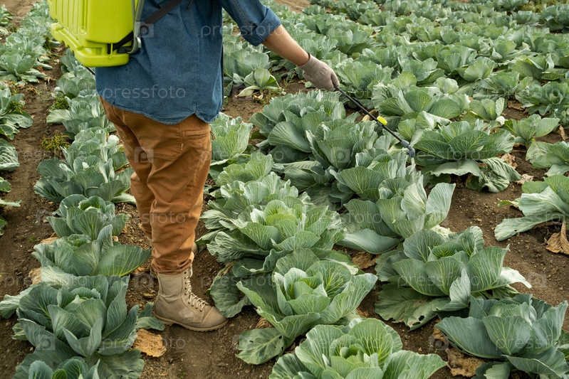 Ноги и руки фермера с распылителем, стоящего в поле капусты