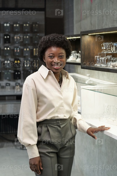 Счастливая молодая африканская женщина-магазинщик в ювелирном бутике