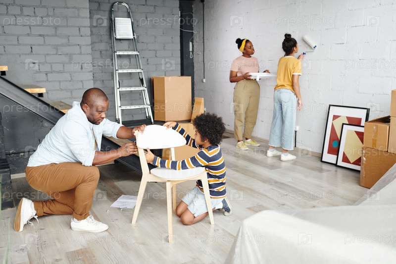Молодой отец и маленький сын собирают стул на полу против матери и дочери, рисующей стену
