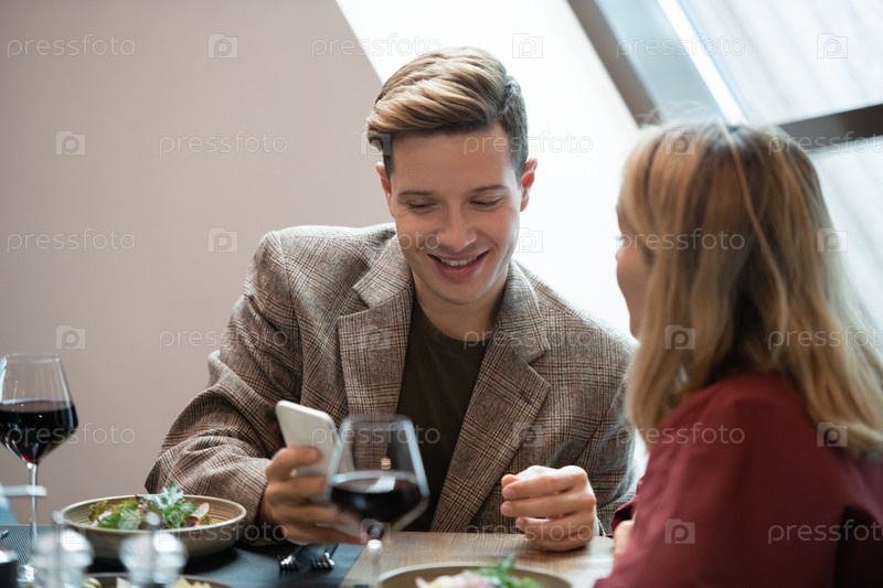 Счастливый молодой человек смотрит на экран смартфона во время просмотра любопытного видео
