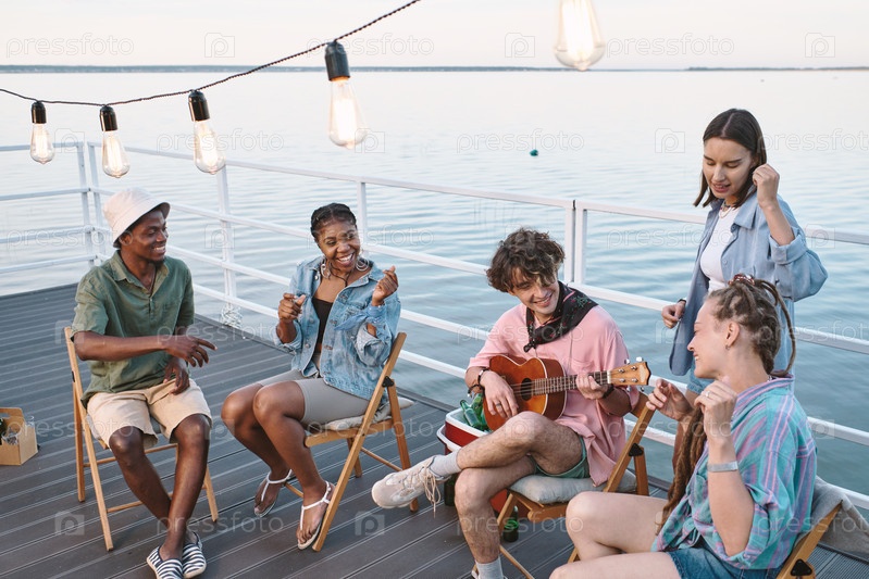 Молодые люди поют на гитаре, проводя время на пирсе в дружелюбный летний день